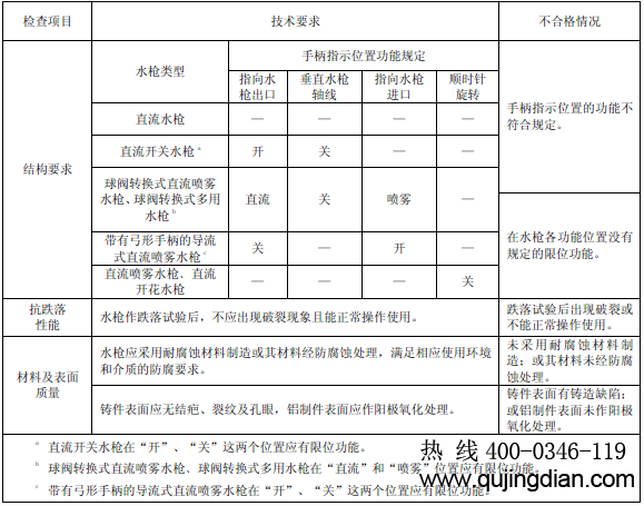 6.11.1.2.1 目測檢查消防水槍各操縱機構動作及限位的情況、指示標記、材料及表面質量。直流噴霧水槍﹑直流開花水槍,其調節噴霧角和開花角的旋轉開關的旋轉方向可從水槍的進水口觀察。